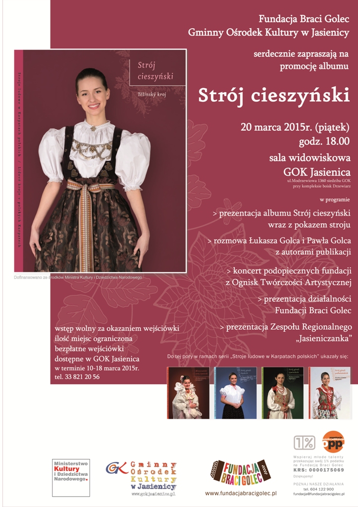 20 marca (piątek) 2015 r. o godz. 18.00 w sali Gminnego Ośrodka Kultury w Jasienicy będzie miało miejsce szczególne wydarzenie – promocja wydanego przez Fundację Braci Golec albumu Strój cieszyński (Těšínský kroj). To już piąta pozycja z serii Stroje ludowe w Karpatach polskich, którą fundacja z powodzeniem realizuje dzięki wsparciu Ministerstwa Kultury i Dziedzictwa Narodowego. Do tej pory w serii ukazały się: Mieszczański strój żywiecki, Strój górali śląskich, Strój górali żywieckich oraz Strój górali podhalańskich.