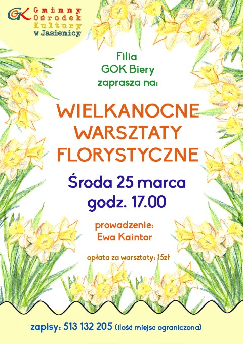 Filia Gminnego Ośrodka Kultury w Bierach zaprasza 25 marca (środa) o godz. 17.00 na warsztaty florystyczne prowadzone przez p. Ewą Kaintor. Podczas warsztatów wykonamy wielkanocne stroiki oraz podzielimy się pomysłami jak udekorować dom na święta.