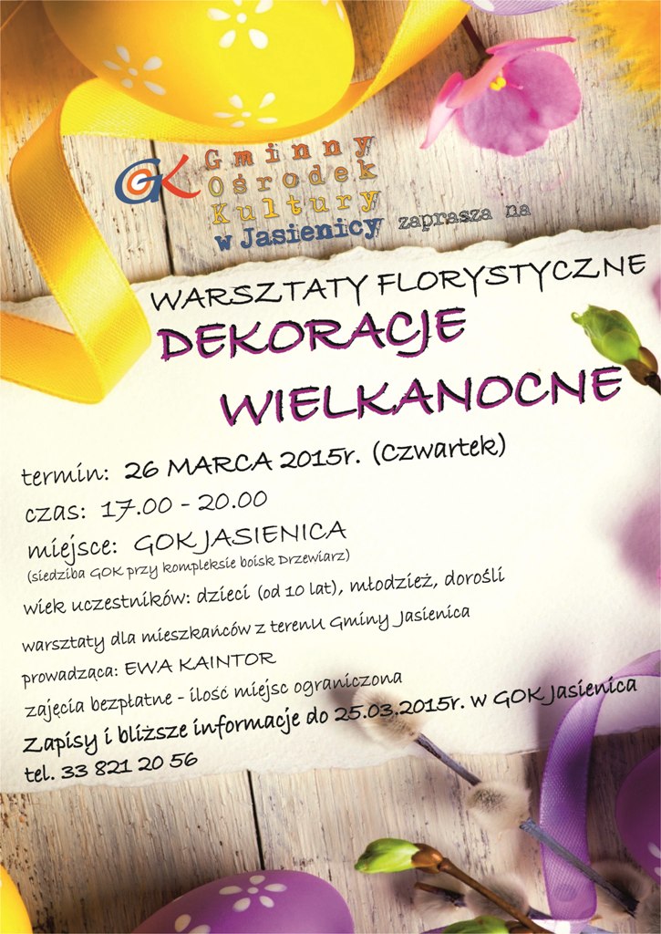 Warsztaty odbędą się 26 marca (czwartek) 2015 r. w godz. od 17.00 do 20.00 w GOK Jasienica (siedziba GOK przy kompleksie boisk Drzewiarz). Warsztaty poprowadzi p. Ewa Kaintor.