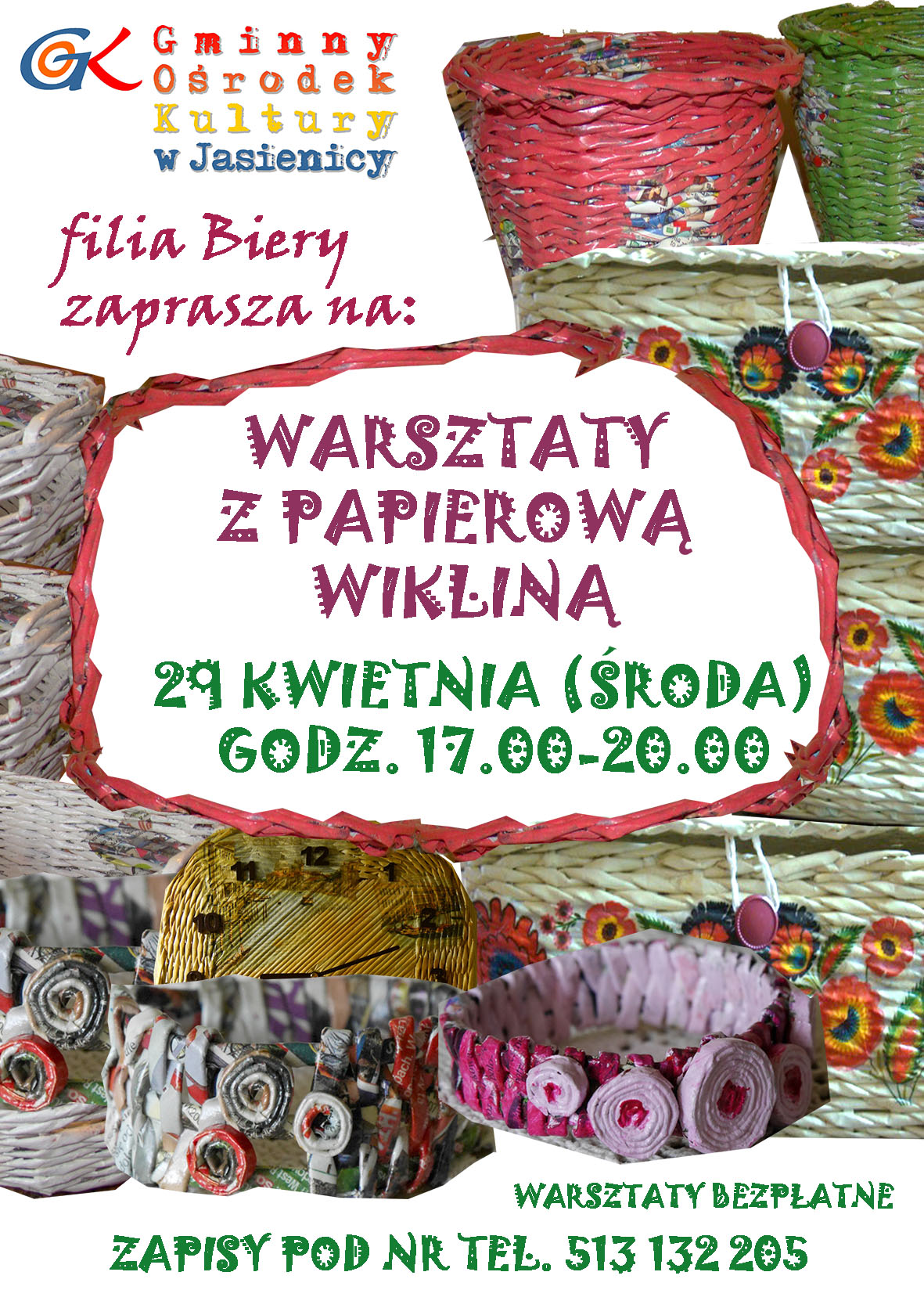 Filia GOK w Bierach zaprasza serdecznie 29 kwietnia (środa) godz. 17.00 na warsztaty z papierową wikliną. Warsztaty poprowadzi Katarzyna Urbaniec bibliotekarka, arteterapeuta i przede wszystkim pasjonatka rękodzieła. Uczestnicy wykonają samodzielnie biżuterię oraz ozdoby do domu. Szczegółowe informacje i zapisy: tel. 513 132 205