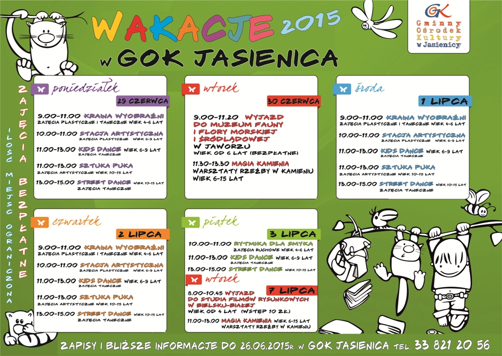 Bliższe informacje oraz zapisy do 26.06.2015 r. w GOK Jasienica, tel.: 33 821 20 56