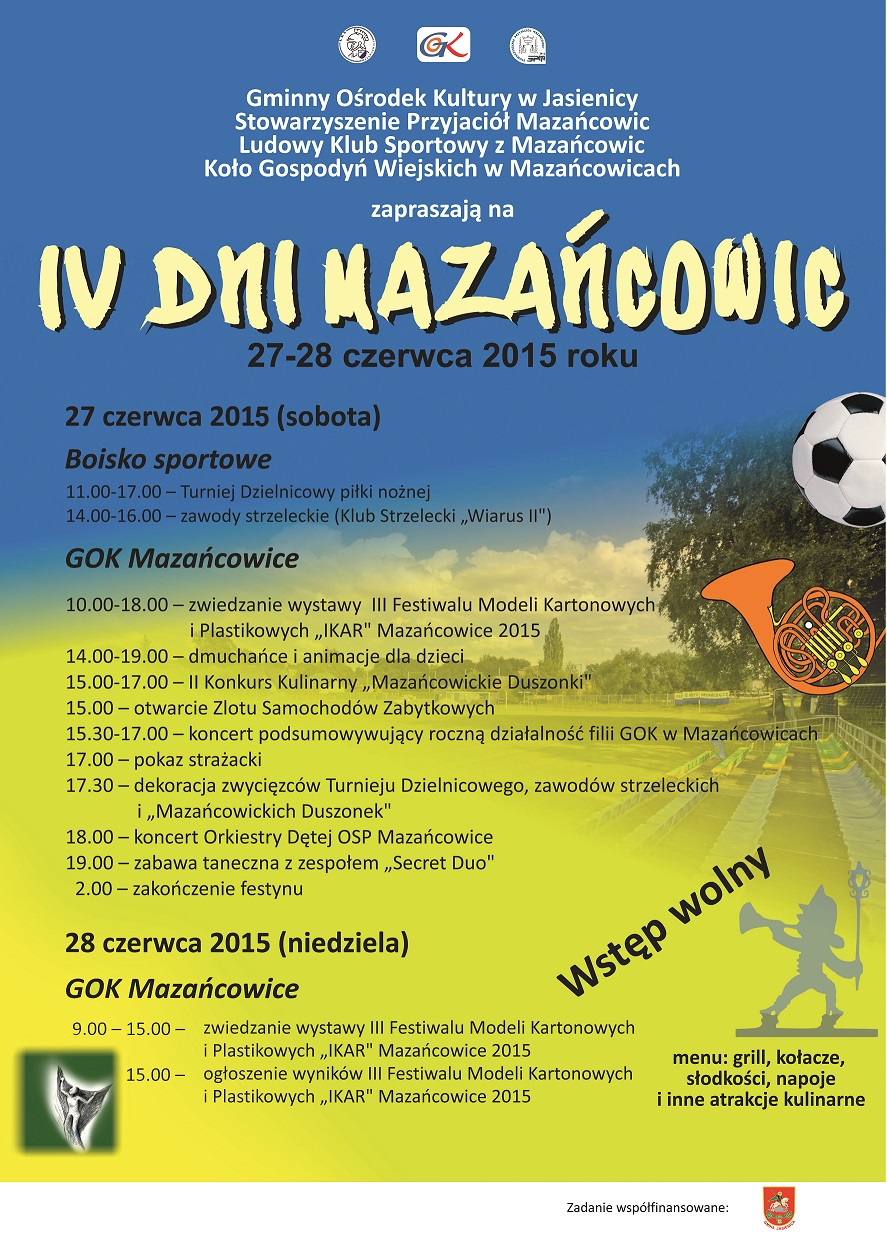Gminny Ośrodek Kultury w Jasienicy, Stowarzyszenie Przyjaciół Mazańcowic, Ludowy Klub Sportowy z Mazańcowic, Koło Gospodyń Wiejskich w Mazańcowicach serdecznie zapraszają w dniach 27 i 28 czerwca 2015 r. na IV Dni Mazańcowic.