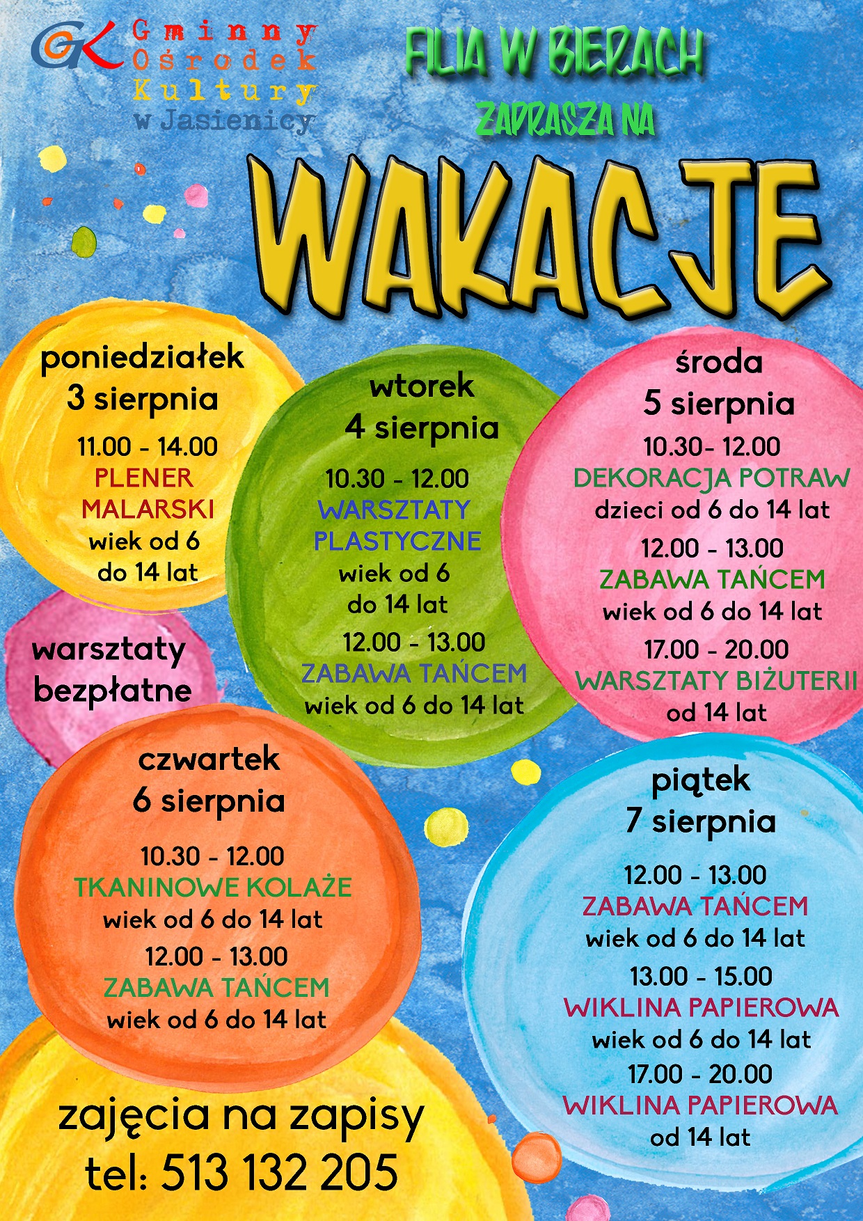Zapraszamy na zajęcia wakacyjne do filii GOK w Bierach.