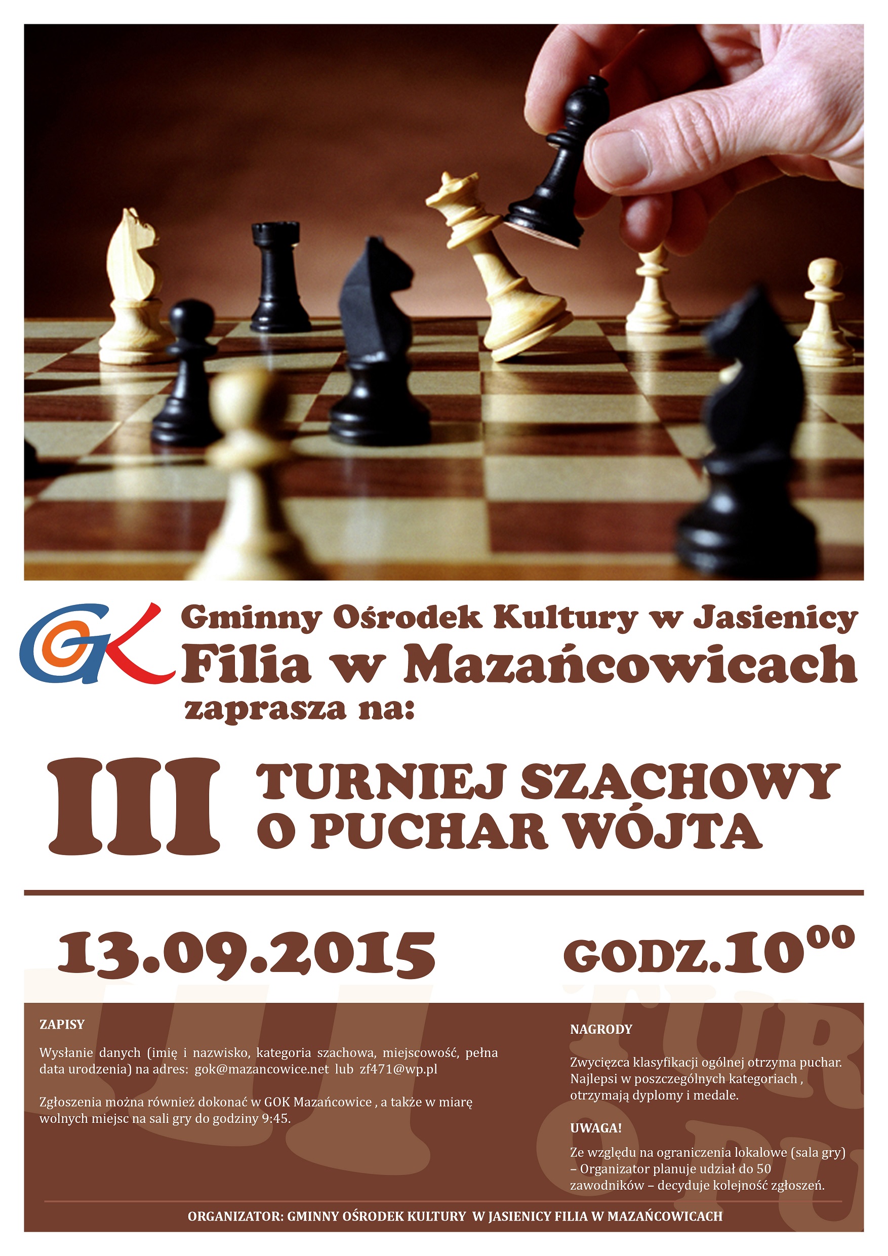 Gminny Ośrodek Kultury w Jasienicy filia w Mazańcowicach zaprasza do udziału w III Turnieju Szachowym o Puchar Wójta Gminy Jasienica.