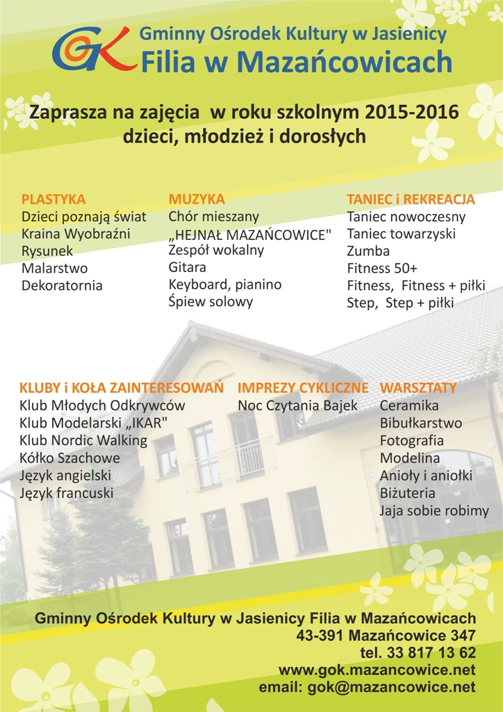 Gminny Ośrodek Kultury w Jasienicy filia w Mazańcowicach zaprasza na zajęcia w roku szkolnym 2015 - 2016 dzieci, młodzież i dorosłych.