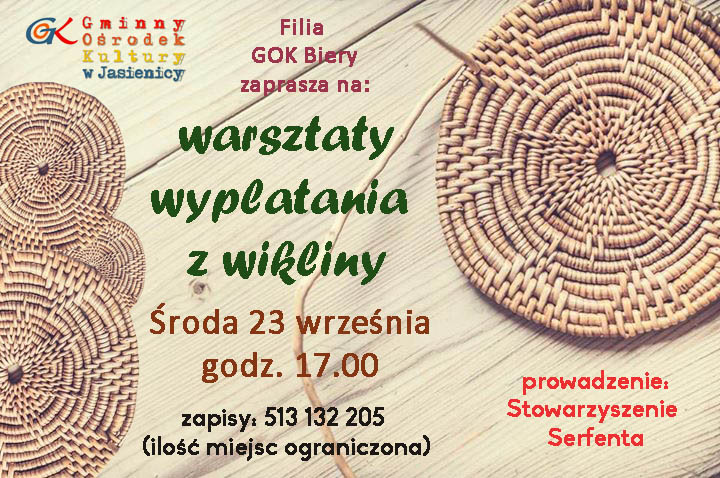 Gminny Ośrodek Kultury w Jasienicy – filia w Bierach zaprasza 23 września (środa) godz. 17.00 na warsztaty wyplatania z wikliny dla dorosłych. Razem ze stowarzyszeniem Serfenta podczas warsztatów uczestnicy poznają różne techniki plecionkarskie i będą mieli możliwość własnoręcznie przygotować wiklinową tackę. Wykonane prace przechodzą na własność uczestników warsztatów.