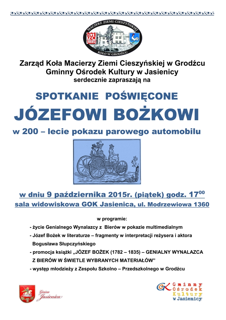 200 lat temu Józef Bożek skonstruował i zaprezentował pierwszy na kontynencie europejskim pojazd z napędem parowym. Z tej niezwykłej okazji zapraszamy na spotkanie poświęcone genialnemu wynalazcy z Bierów. Spotkanie odbędzie się 9 października (piątek) 2015 r., o godz. 17.00 w Gminnym Ośrodku Kultury w Jasienicy (ul. Modrzewiowa 1360).