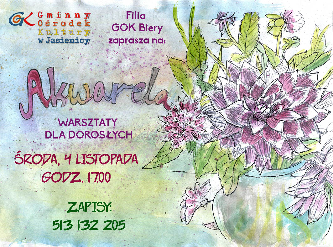 Filia GOK w Bierach serdecznie zaprasza 4 listopada (środa) o godz. 17.00 na warsztaty malowania akwarelami.