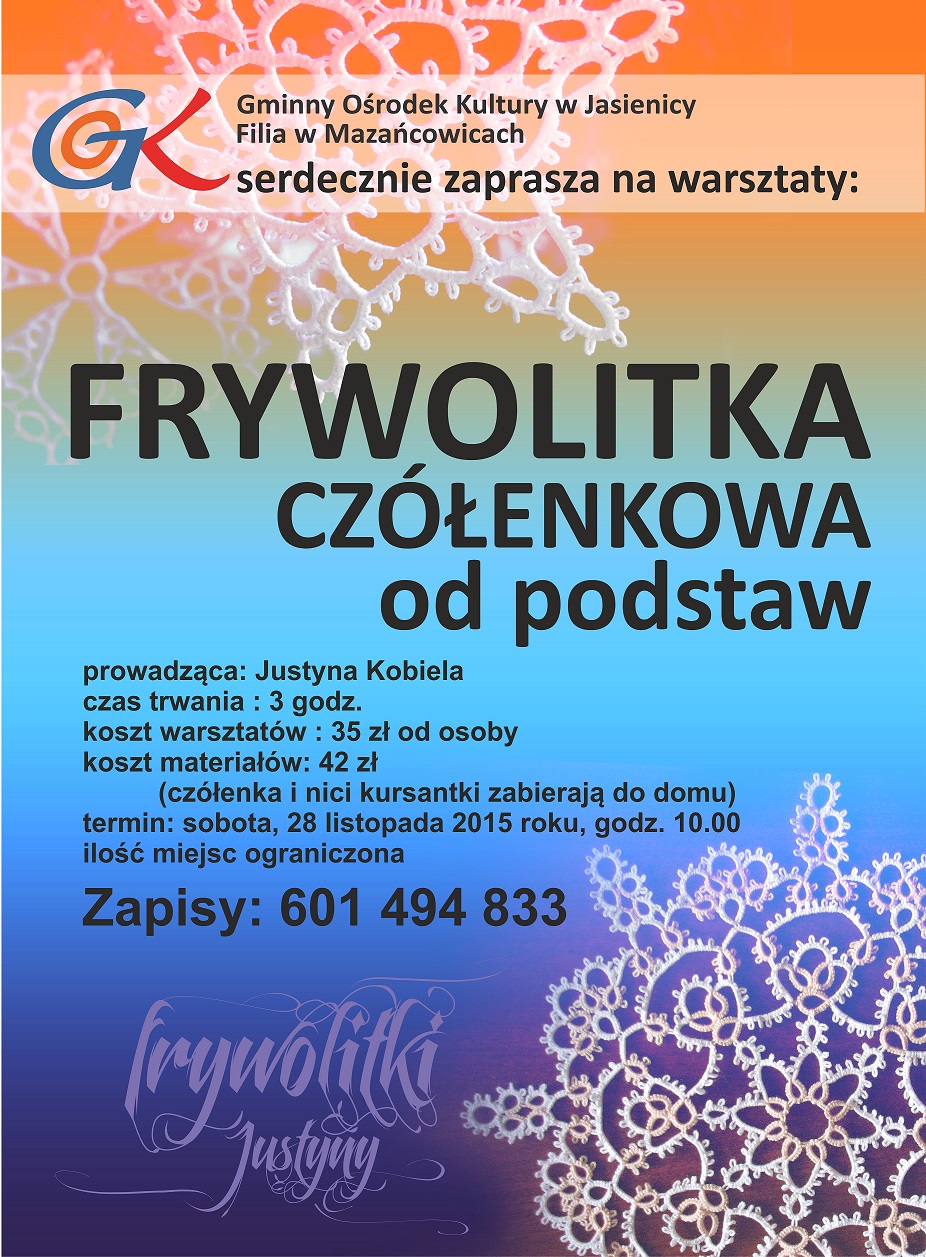 Zapraszamy do filii GOK w Mazańcowicach na warsztaty: "Frywolitka czółenkowa od podstaw".