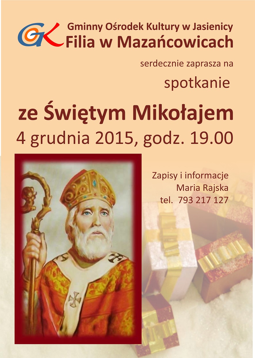 4 grudnia 2015 r. o godz. 19.00 zapraszamy do filii GOK w Mazńcowicach na spotkanie ze Świętym Mikołajem.