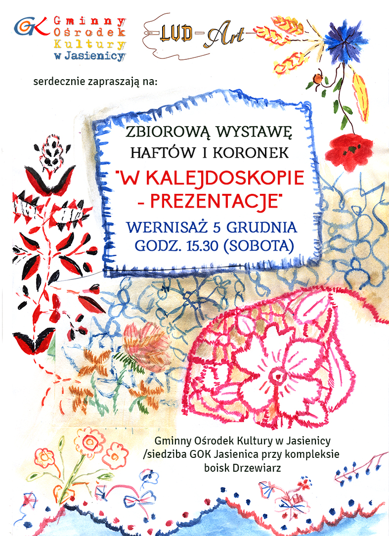 Gminny Ośrodek Kultury w Jasienicy zaprasza 5 grudnia 2015 r. o godz. 15.30 na wernisaż wystawy prac hafciarskich i koronkarskich członkiń Stowarzyszenia Miłośników Tradycyjnego Rękodzieła Ludowego i Artystycznego Lud-Art przy Muzeum Etnograficznym w Krakowie.