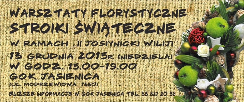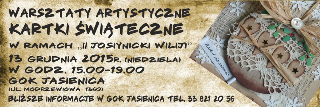 Impreza odbędzie się 13 grudnia 2015 r. w GOK Jasienica (siedziba GOK przy boiskach "Drzewiarz", ul.Modrzewiowa 1360) w godz. od 15.00 do 19.00.