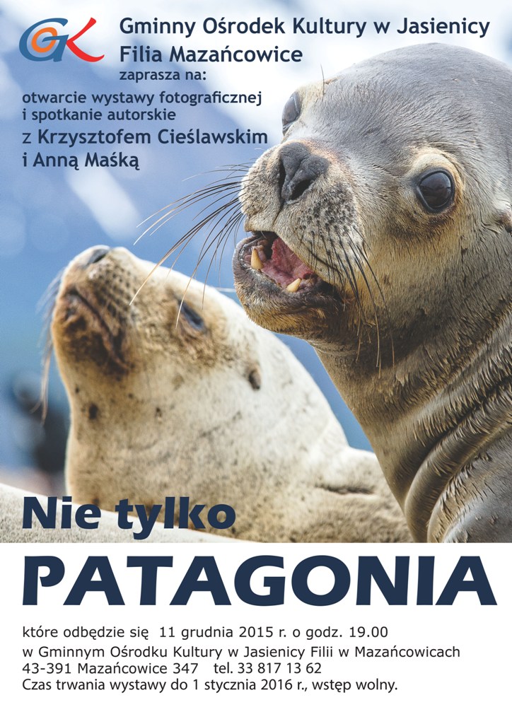 Gminny Ośrodek Kultury w Jasienicy filia w Mazańcowicach zaprasza na otwarcie wystawy fotograficznej i spotkanie autorskie z Krzysztofem Cieślawskim i Anną Maśką "Nie tylko Patagonia". Impreza odbędzie się 11 grudnia 2015 r. o godz. 19.00