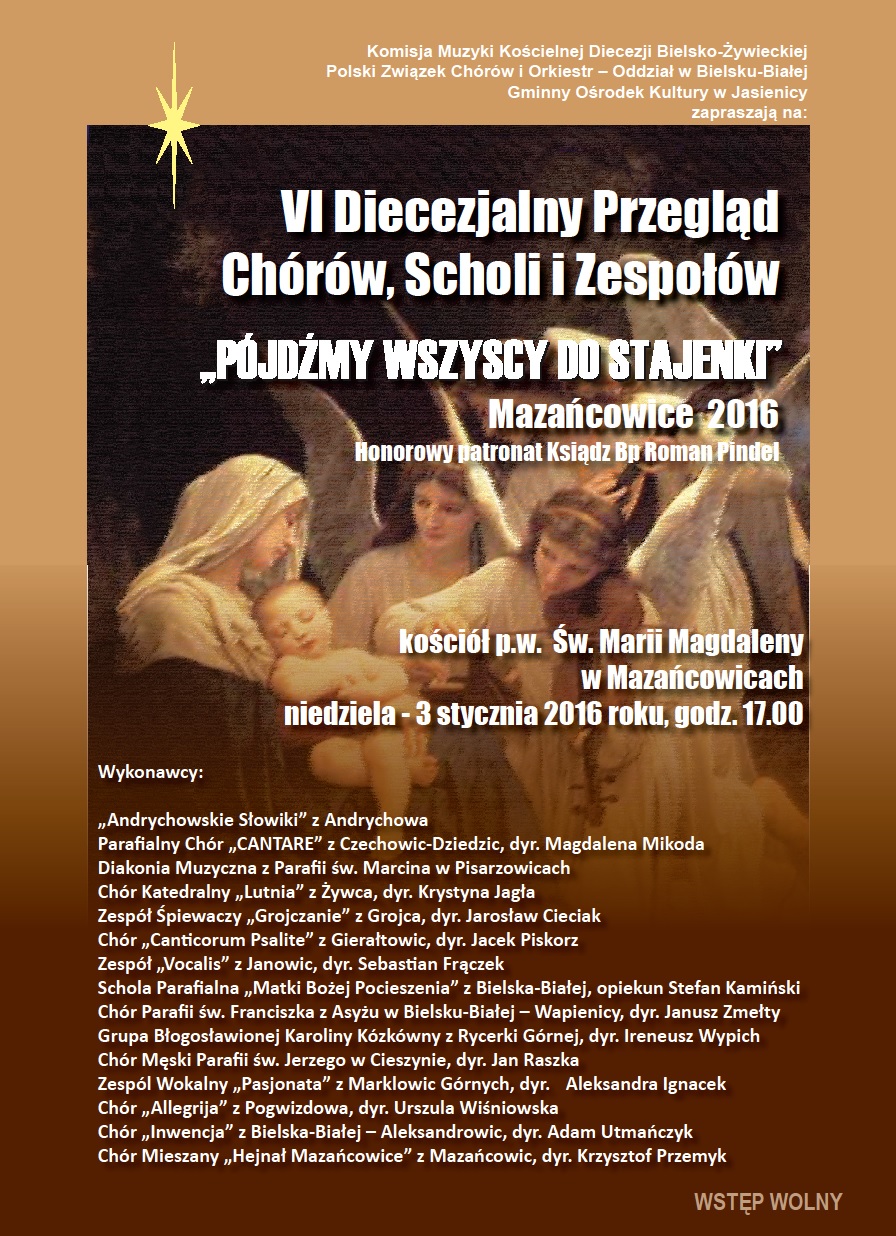 Zapraszamy na VI Diecezjalny Przegląd Chórów, Scholi i Zespołów "Pójdźmy wszyscy do stajenki" Mazańcowice 2016.