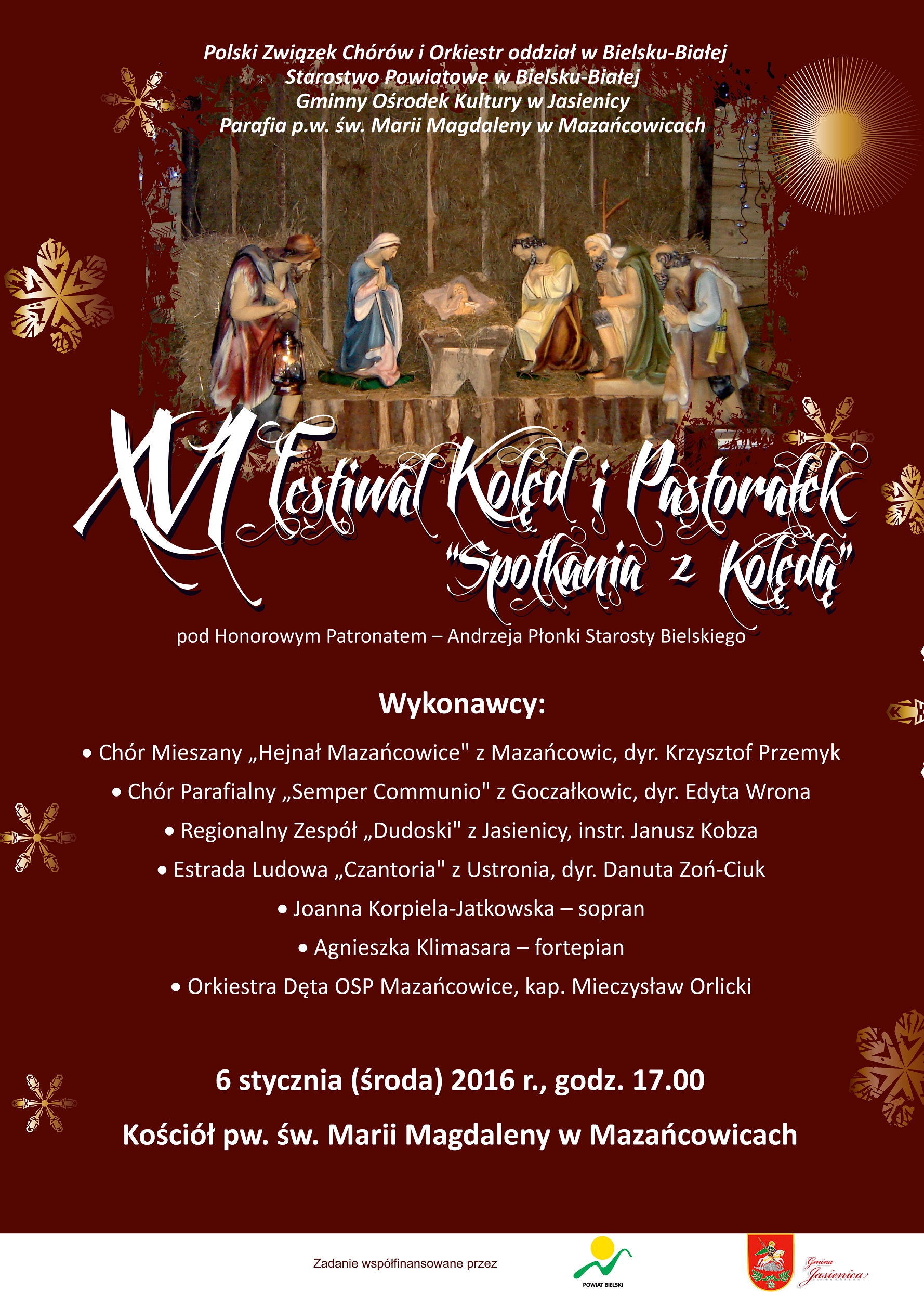 Festiwal odbędzie się 6 stycznia (środa) 2016 r. o godz. 17.00 w kościele pw. św. Marii Magdaleny w Mazańcowicach.