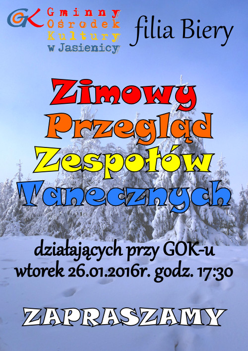 26 stycznia (wtorek) o godz. 17.30 zapraszamy do filii GOK w Bierach na Zimowy Przegląd Zespołów Tanecznych. Podczas przegladu wystąpią zespoły taneczne działające w filii GOK w Bierach.