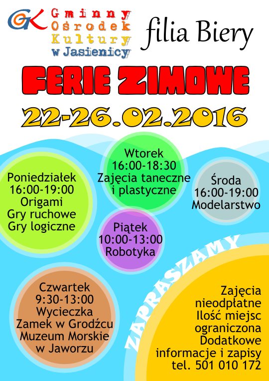 Zapraszamy na ferie zimowe do filii GOK w Bierach.