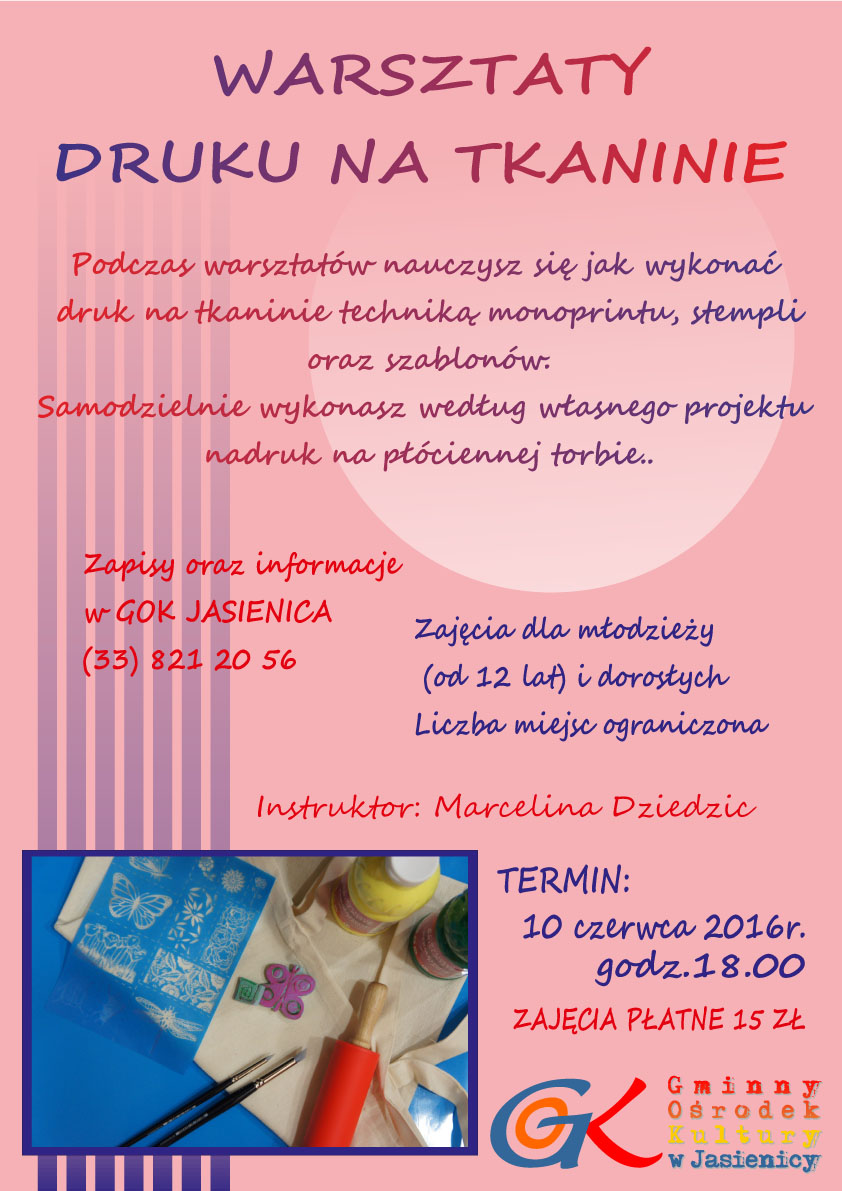 Wszystkich chętnych, którzy chcą zgłębić tajniki druku na tkaninach, zapraszamy 10 czerwca 2016 r. (piątek) do Gminnego Ośrodka Kultury w Jasienicy. Warsztaty rozpoczniemy o godz. 18.00.