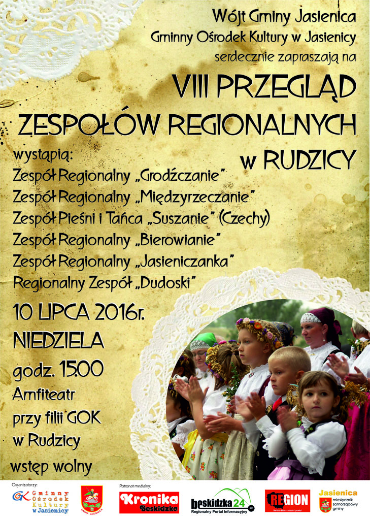 Zapraszamy na VIII Przegląd Zespołów Regionalnych. Impreza odbędzie się 10 lipca (niedziela) 2016 r.  na terenie amfiteatru przy filii GOK w Rudzicy. Start godz. 15.00
