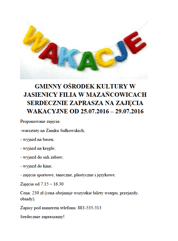 Od 25 do 29 lipca zapraszamy na płatne zajęcia wakacyjne do filii GOK w Mazańcowicach.