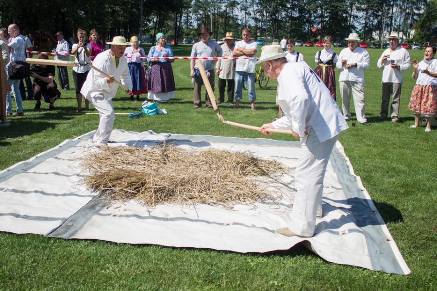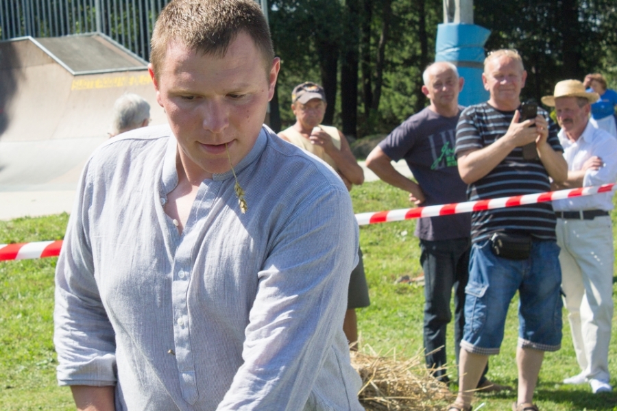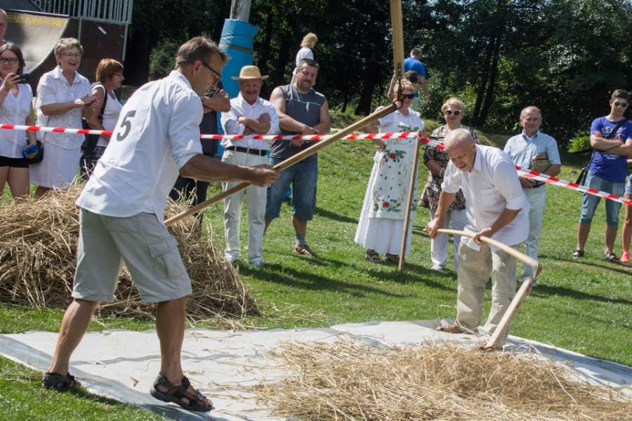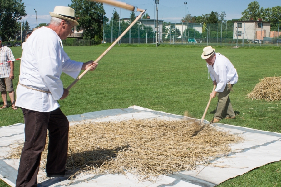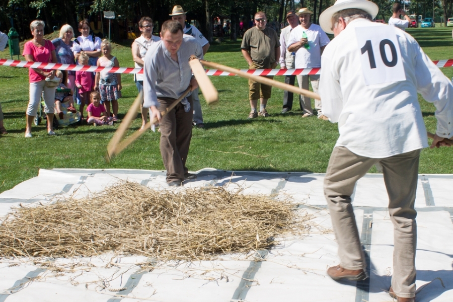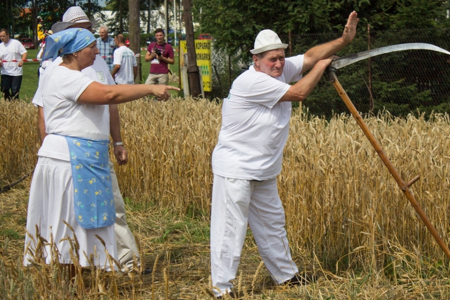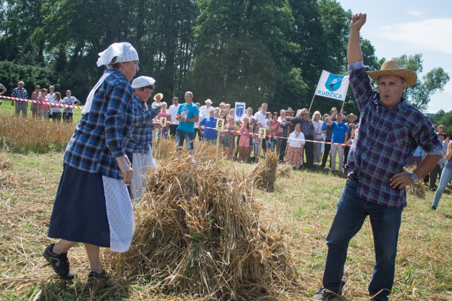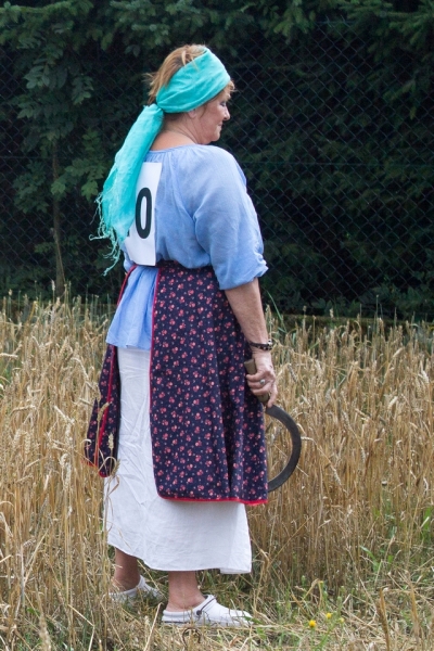 Trzyosobowa drużyna na wcześniej wylosowanym poletku: 1 osoba kosiła zboże, 2 osoby zbierały zboże, wiązały je w snopki i ustawiły kopki. Ocenie podlegał czas i jakość.