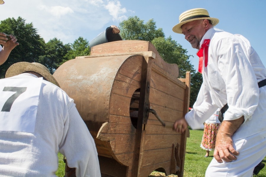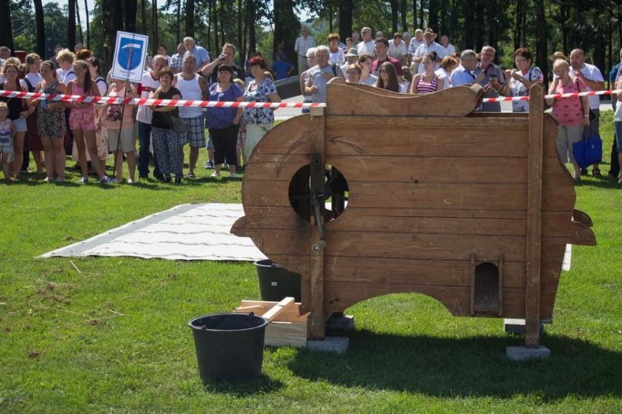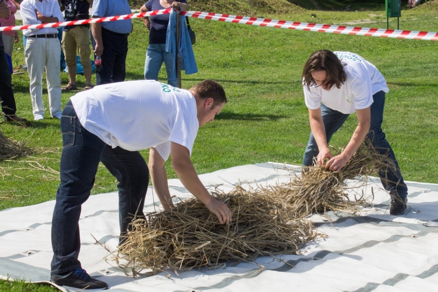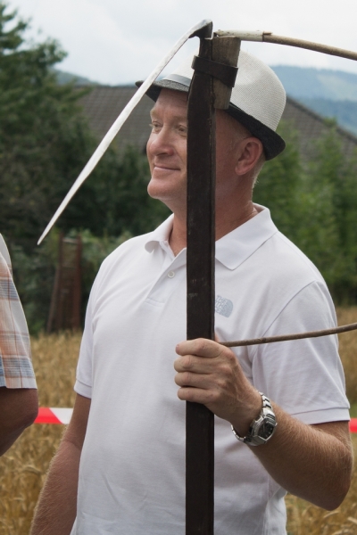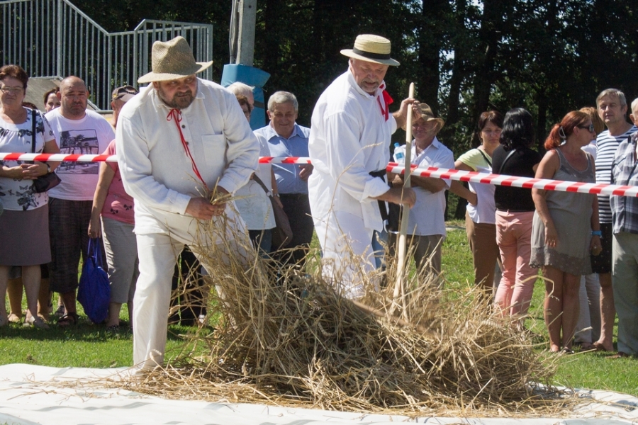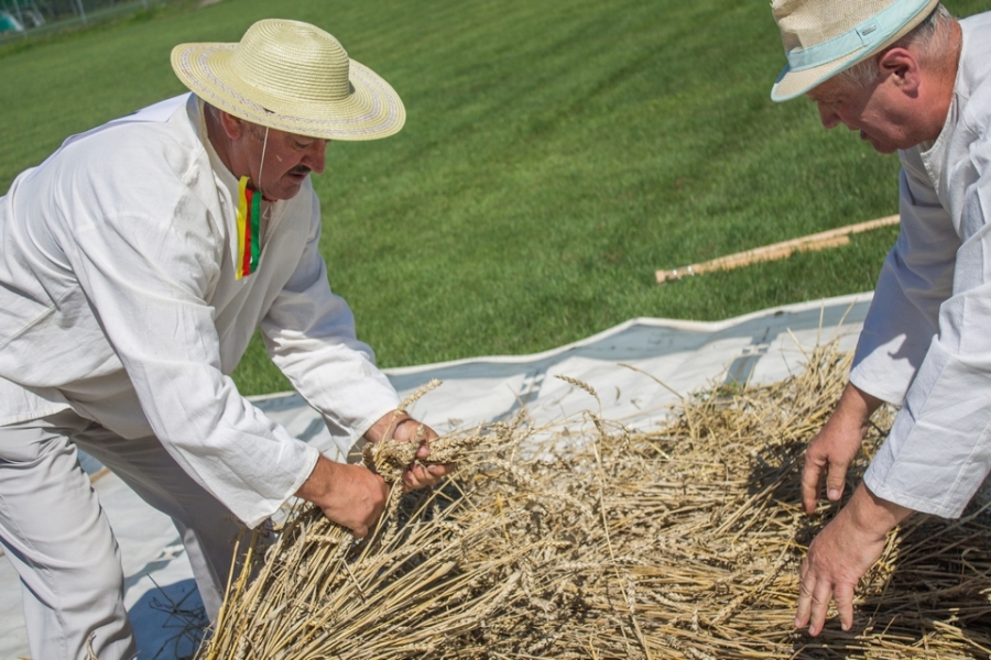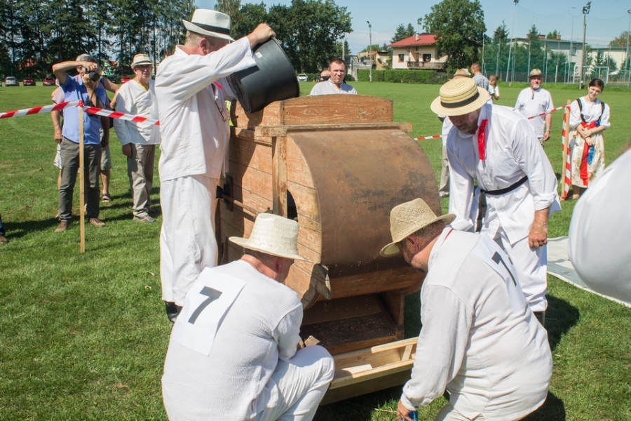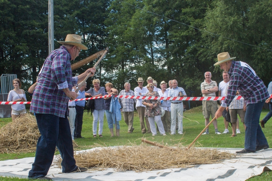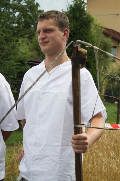 Trzyosobowa drużyna na wcześniej wylosowanym poletku: 1 osoba kosiła zboże, 2 osoby zbierały zboże, wiązały je w snopki i ustawiły kopki. Ocenie podlegał czas i jakość.