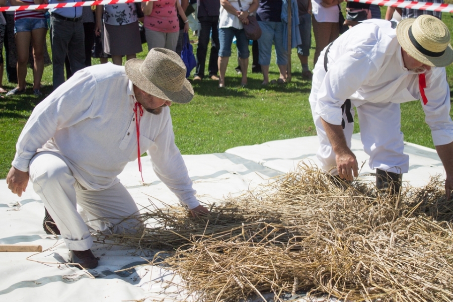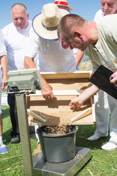 Drużyna dwuosobowa młóciła wylosowane snopki – 6 szt na drużynę. Konkurencja trwała 2 minuty. Po upływie czasu zawodnicy zebrali wymłócone zboże i przesiali je przez sito, następnie zboże zważono. Ocenie podlegała waga wymłóconego zboża.