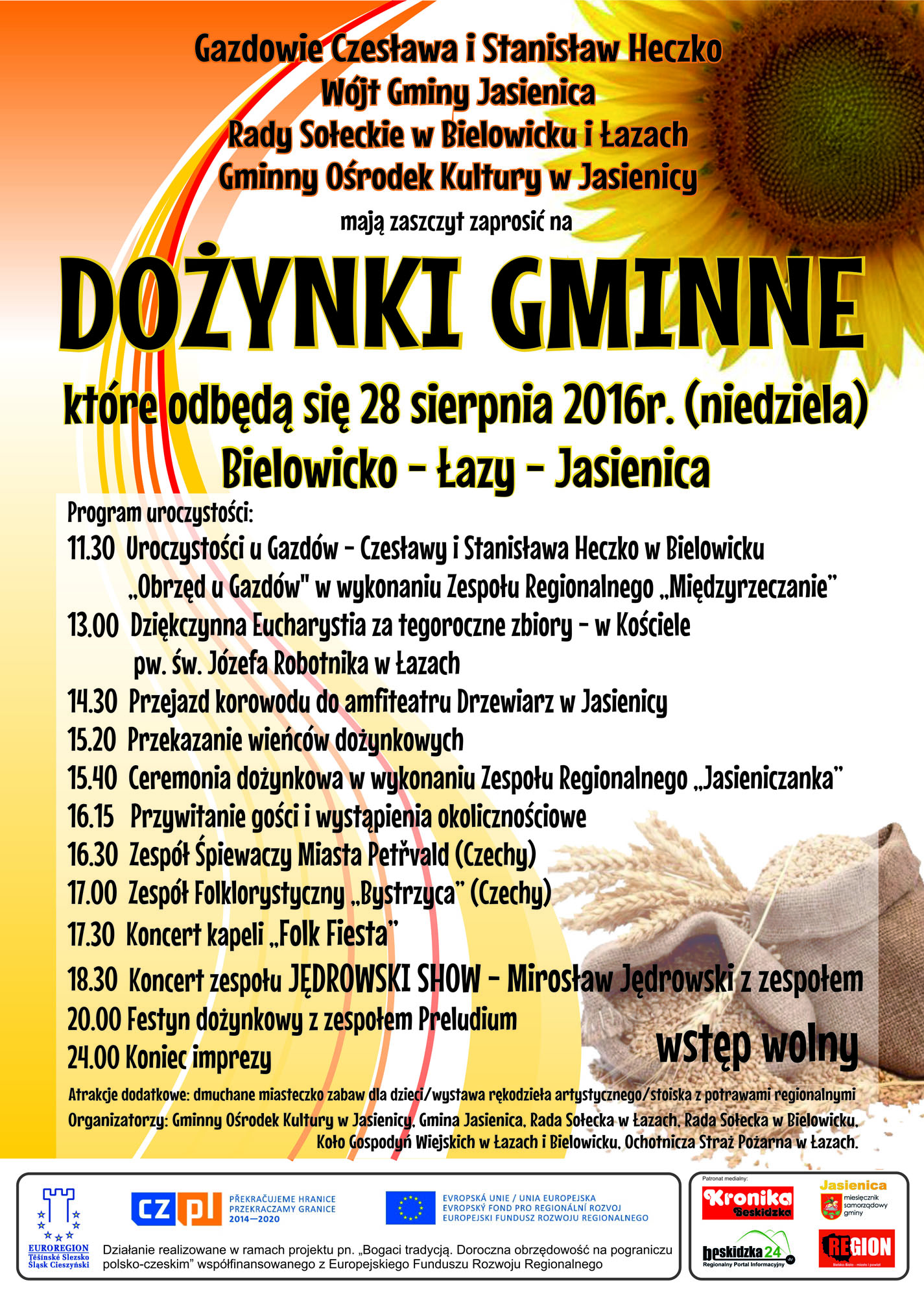 Impreza dożynkowa realizowana jest w ramach projektu "Bogaci tradycją. Doroczna obrzędowość na pograniczu polsko - czeskim", współfinansowanego z Europejskiego Funduszu Rozwoju Regionalnego.