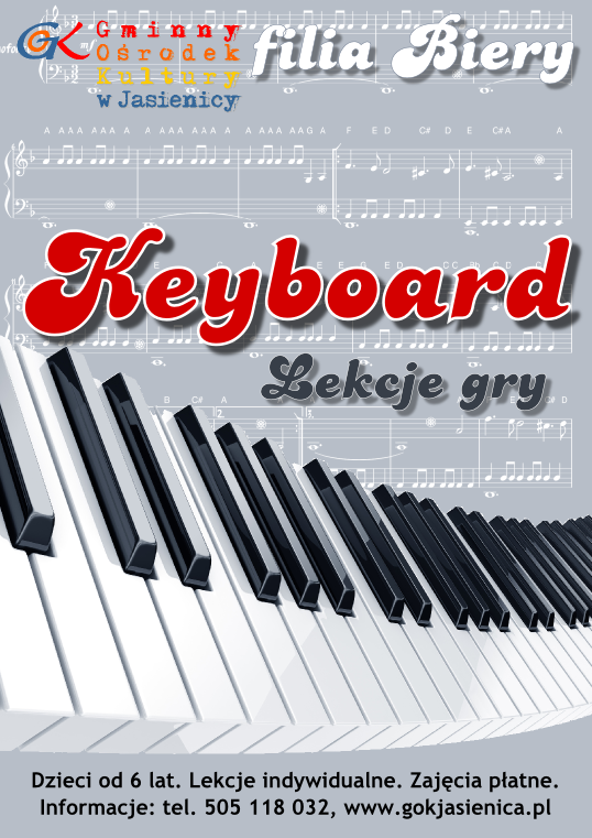 Zapraszamy do filii GOK w Bierach na indywidualne lekcje gry na pianinie i keybordzie. Zajęcia odbywają się poniedziałki oraz wtorki w godzinach od 16:00-18:30. Zebranie organizacyjne odbędzie się 13.09.2016r. (wtorek) o godzinie 17:00 w filii GOK w Bierach.