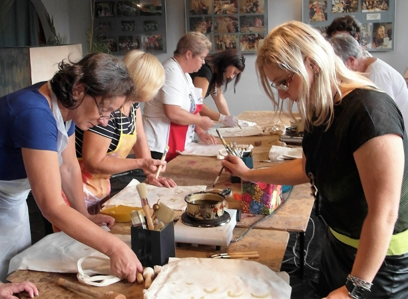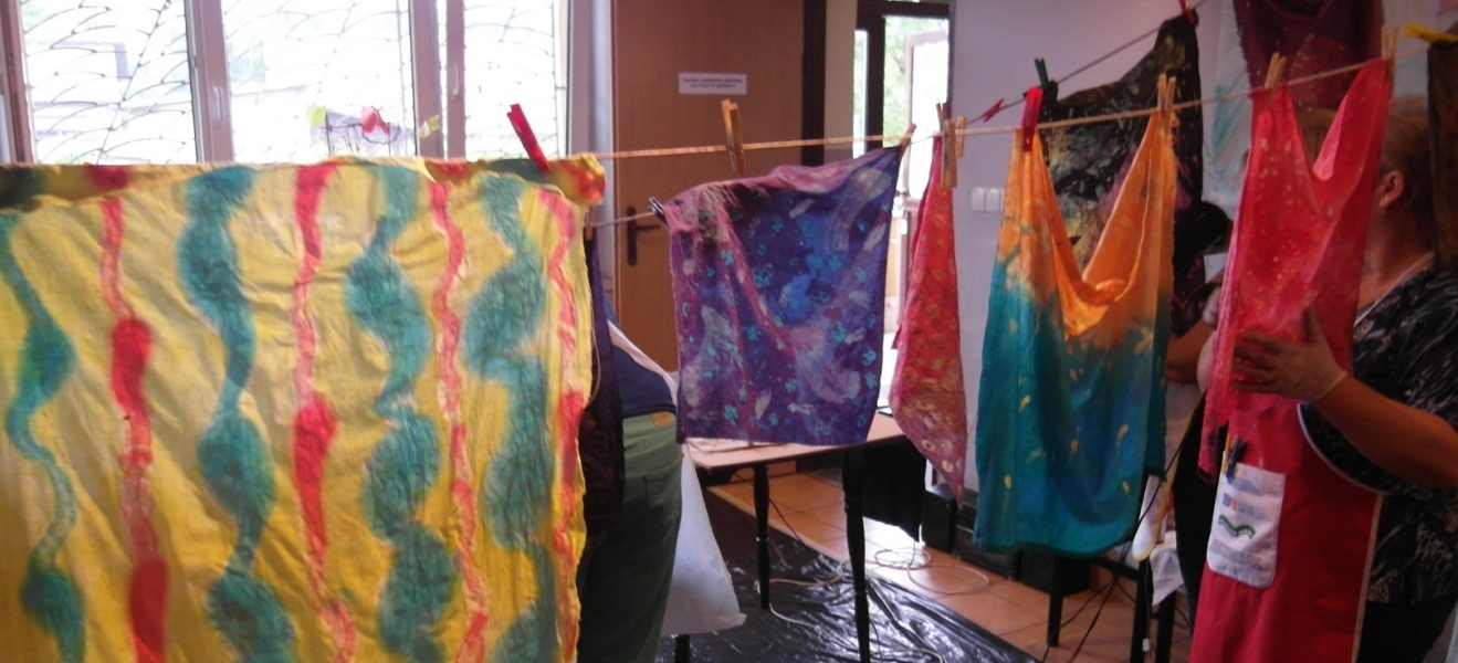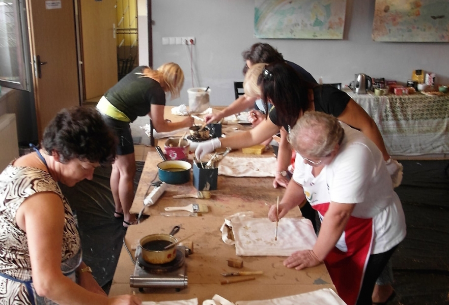 W filii GOK w Bierach odbyły się dwudniowe warsztaty batiku. Batik to technika malarska polegająca na kolejnym nakładaniu wosku i kąpieli tkaniny w barwniku, który farbuje jedynie miejsca nie zamaskowane warstwą wosku. Dla uzyskania specjalnych efektów proces woskowania i farbowania można powtarzać wielokrotnie. Po wykonaniu projektowanego wzoru tkaninę prasuje się przez biały papier. Batik to technika wykonywana od wielu pokoleń, najbardziej popularna w Indonezji i innych krajach Azji. Pod okiem instruktora Pani Katarzyny Brody – Firla, uczestniczki zajęć rozwijały swoje talenty malarskie, ucząc się krok po kroku tej techniki. W pierwszym etapie panie wykonały barwne torebki, a następnie na większych formatach malowały obrazy. Końcowy efekt pracy miło zaskoczył nasze uczestniczki. Powstały bardzo piękne prace, które można obejrzeć na załączonej relacji fotograficznej. Dziękujemy za udział i zaangażowanie oraz zapraszamy na kolejne warsztaty artystyczne w naszej filii.