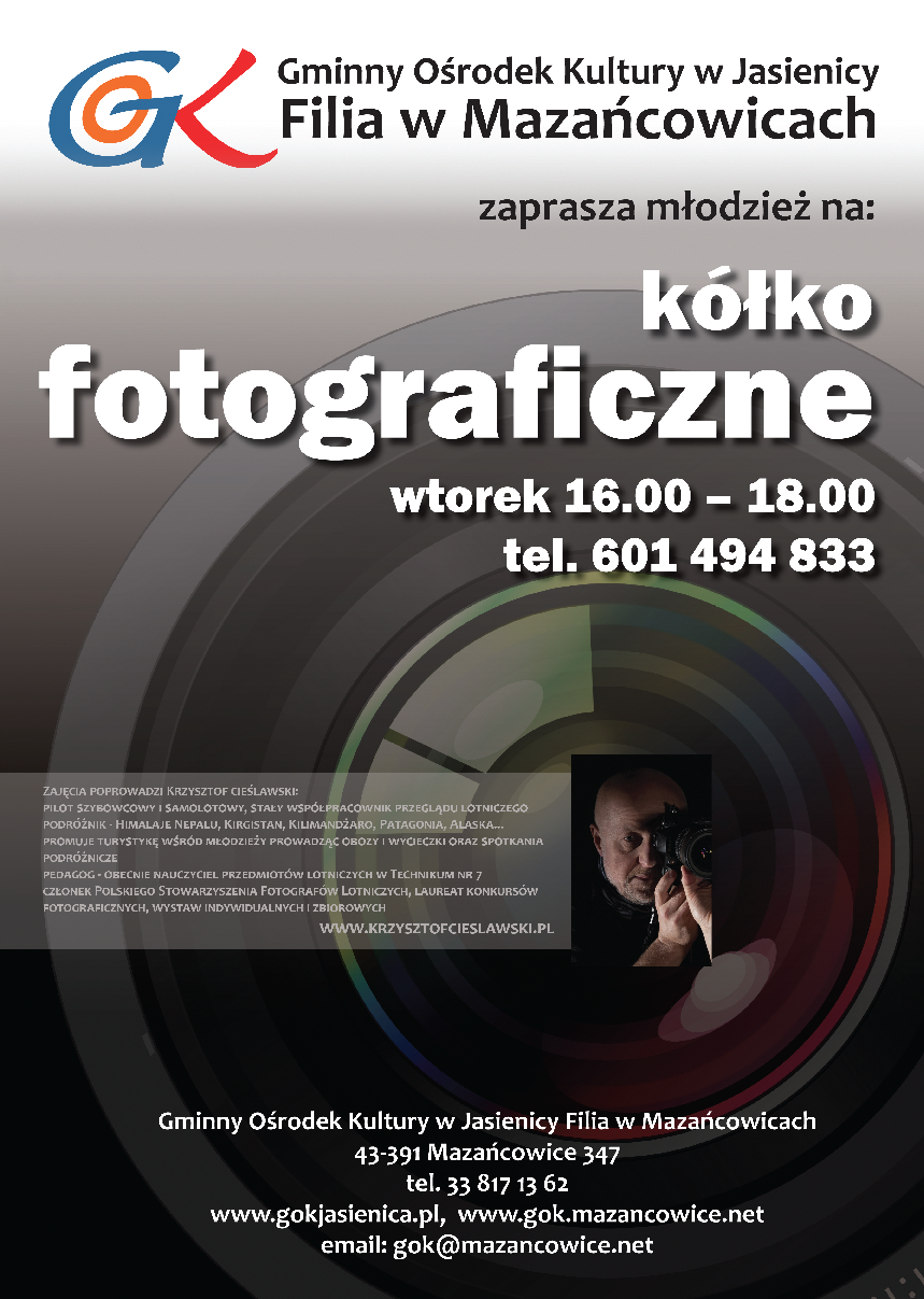 Miłośników fotografii zapraszamy do filii GOK w Mazańcowicach na zajęcia koła fotograficznego. Spotkania odbywają się we wtorki w godz. od 16.00 do 18.00. Zajęcia prowadzi Krzysztof Cieślawski - fotograf, podróżnik, pedagog, pilot szybowcowy i samolotowy.