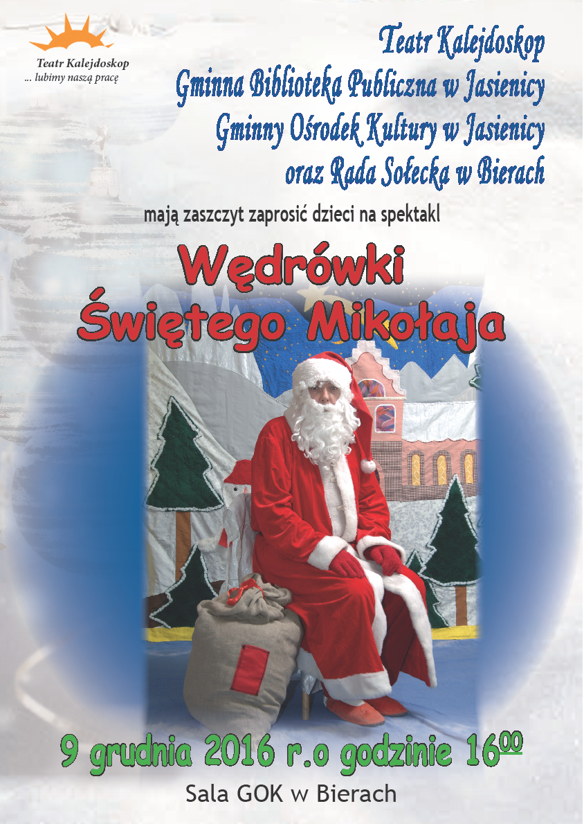 Zapraszamy dzieci na spektakl pt. "Wędrówki Świętego Mikołaja". Widowisko w wykonaniu aktorów Teatru Kalejdoskop będzie można obejrzeć: