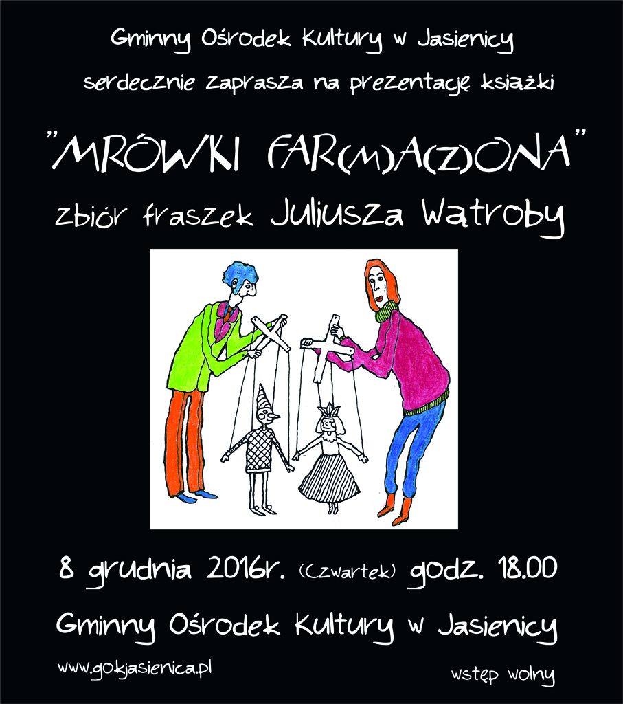 Gminny Ośrodek Kultury w Jasienicy zaprasza na prezentację książki "MRÓWKI FAR(M)A(Z)ONA" - zbioru fraszek Juliusza Wątroby. Spotkanie odbędzie się 8 grudnia 2016 r. (czwartek) o godz. 18.00 w Gminnym Ośrodku Kultury w Jasienicy (ul. Modrzewiowa 1360).