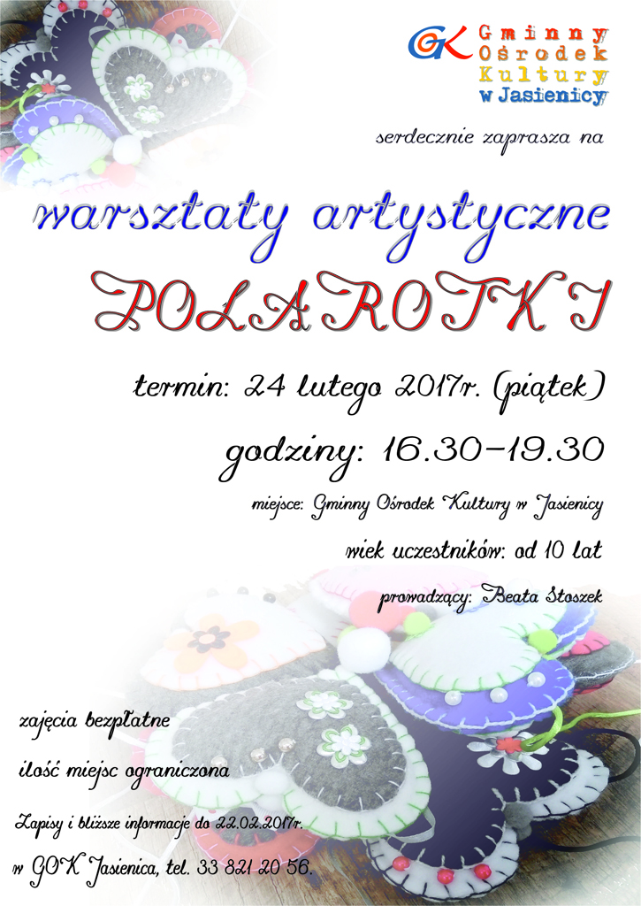 Na warsztaty zapraszamy do GOK Jasienica 24 lutego 2017 r. (piątek) w godz. od 16.30 do 19.30.