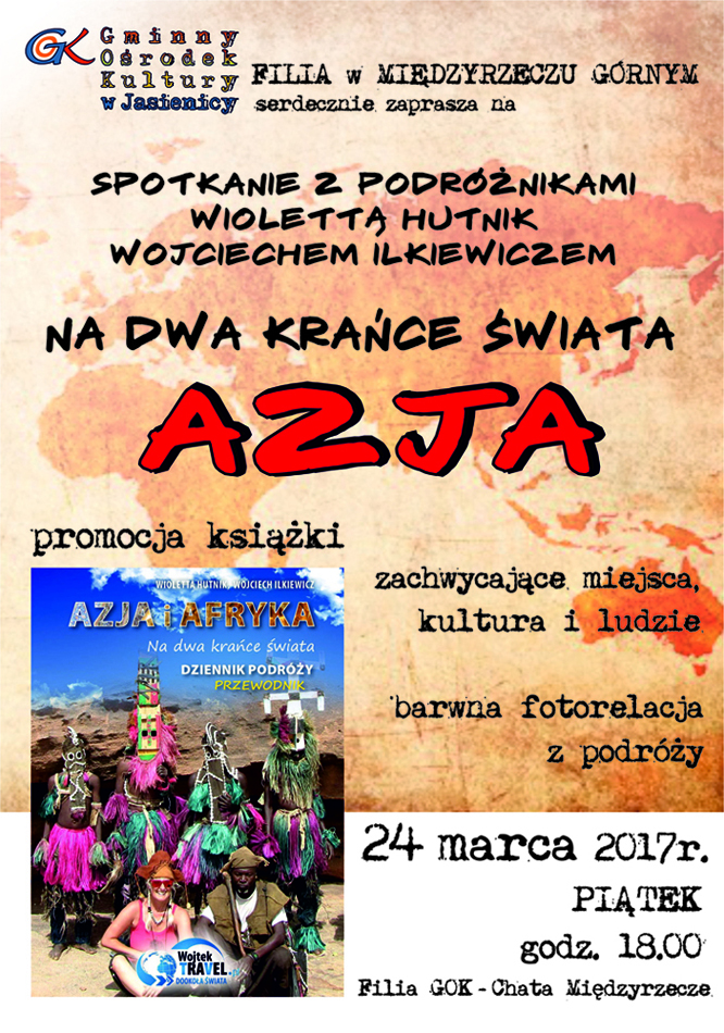 Na spotkanie podróżnicze i promocję książki zapraszamy do filii Gminnego Ośrodka Kultury w Międzyrzeczu Górnym. Wrażeniami podzielą się globtroterzy Wioletta Hutnik i Wojciech Ilkiewicz. Spotkanie odbędzie się 24 marca 2017 r. (piątek) o godz. 18.00 w filii GOK - Chata Międzyrzecze.