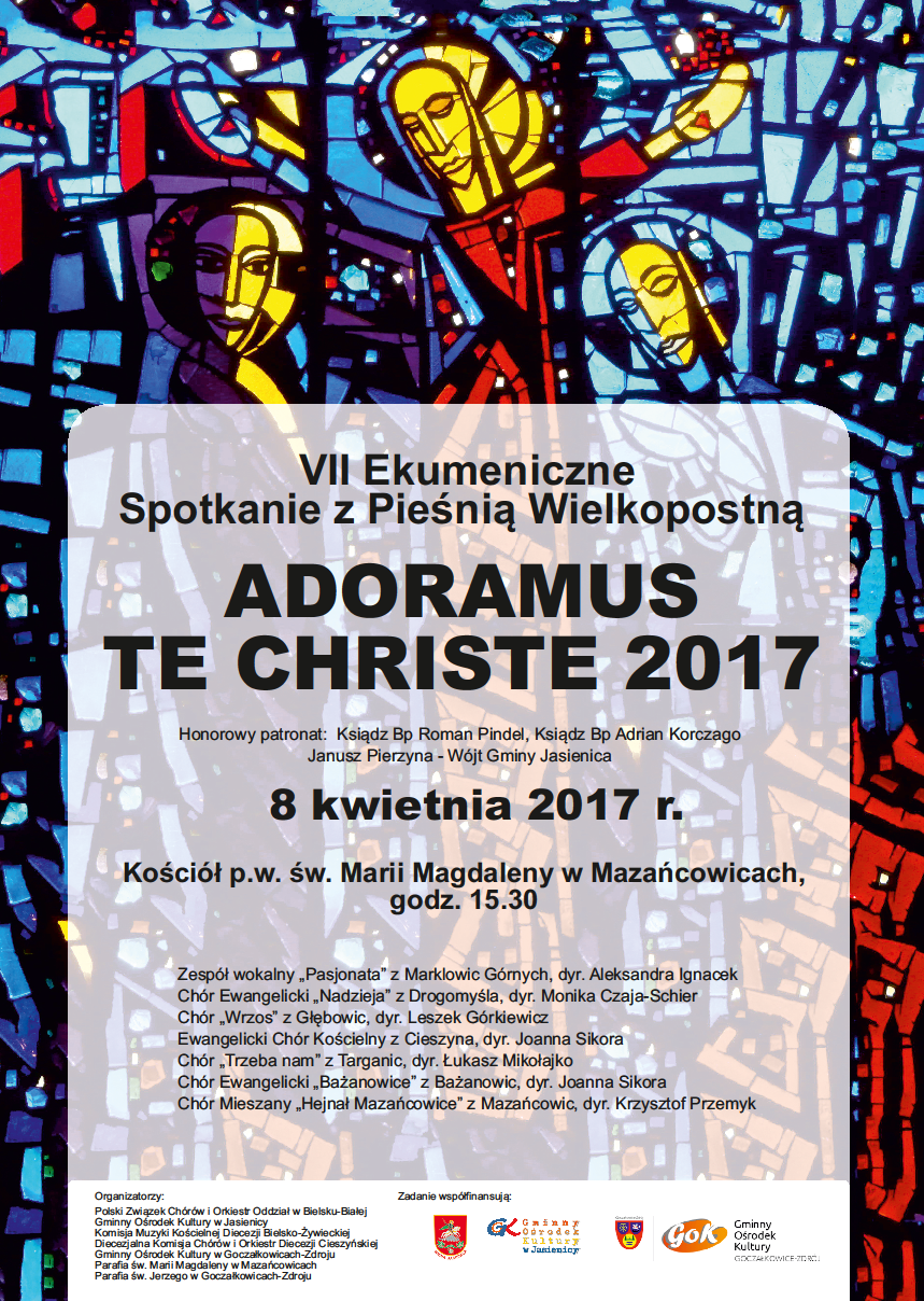 Zapraszamy na VII Ekumeniczne Spotkanie z Pieśnią Wielkopostną "ADORAMUS TE CHRISTE 2017". Koncert odbędzie się 8 kwietnia 2017 r. w kościele p.w. św. Marii Magdaleny w Mazańcowicach o godz. 15.30.