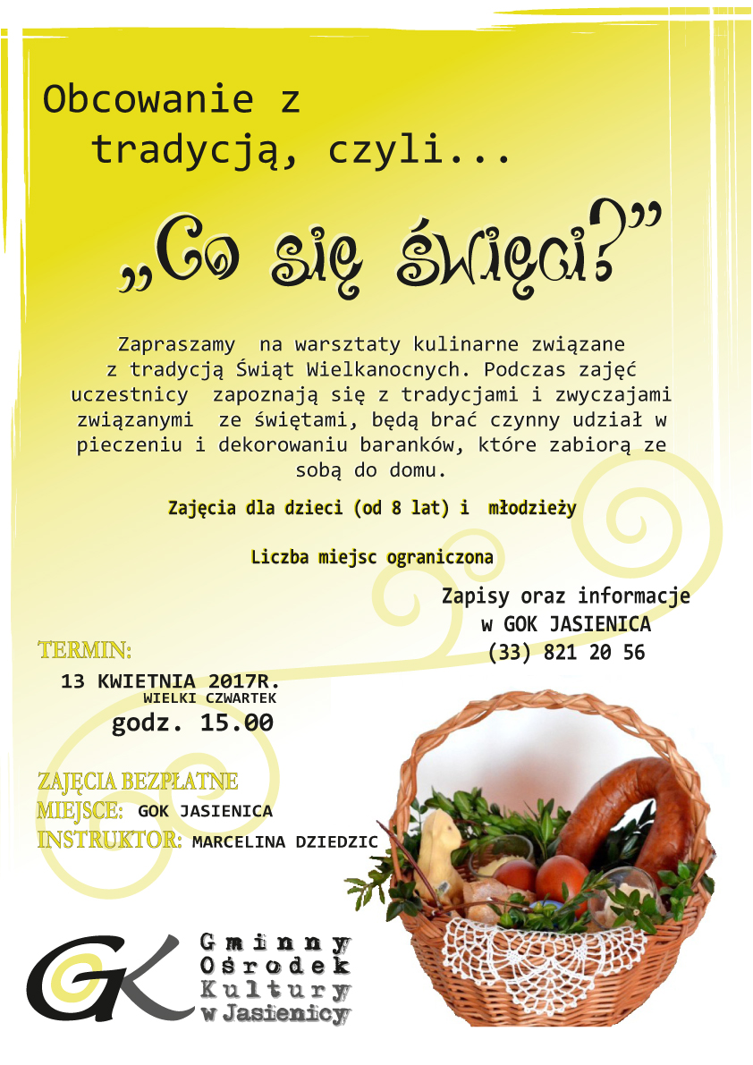Zapraszamy dzieci (od 8 lat) i młodzież na warsztaty kulinarne "Co się święci?" związane z tradycją Świąt Wielkanocnych. Zajęcia odbędą się 13 kwietnia 2017 r. o godz. 15.00 w GOK Jasienica.